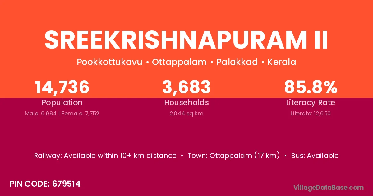 Sreekrishnapuram Ii village has a total population of 14,736 people, of which 6,984 are males and 7,752 are females.