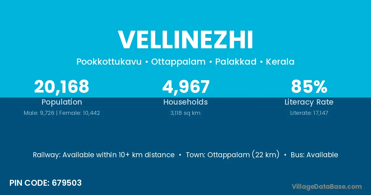 Ottappalam (22 km) is the nearest town to Vellinezhi village for major economic activities and is located approximately 22 km away.