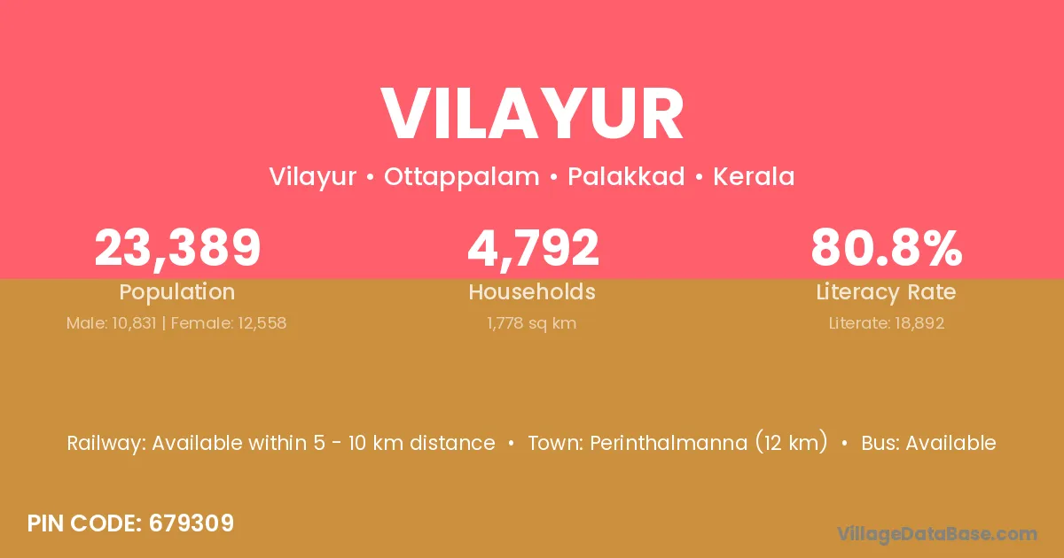 Perinthalmanna (12 km) is the nearest town to Vilayur village for major economic activities and is located approximately 12 km away.