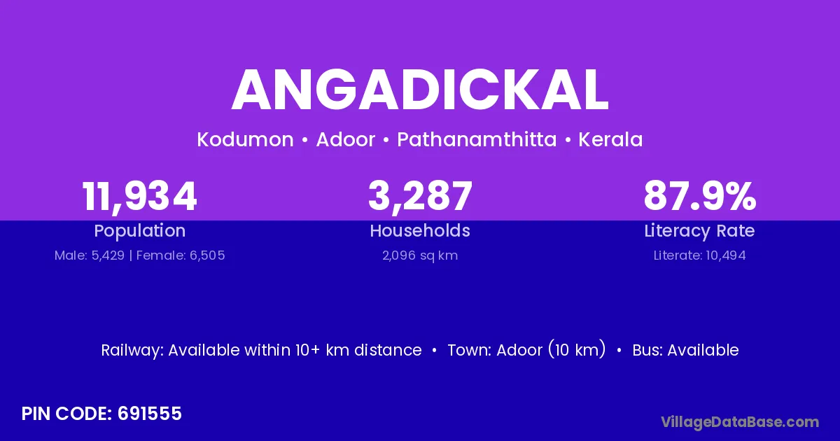 Adoor (10 km) is the nearest town to Angadickal village for major economic activities and is located approximately 10 km away.