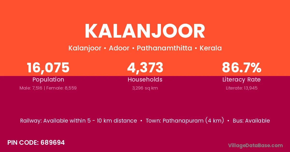 Pathanapuram (4 km) is the nearest town to Kalanjoor village for major economic activities and is located approximately 4 km away.