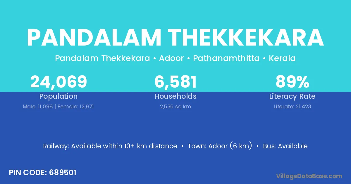 Adoor (6 km) is the nearest town to Pandalam Thekkekara village for major economic activities and is located approximately 6 km away.