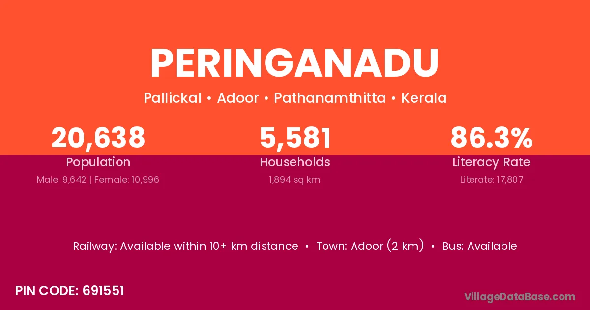 Adoor (2 km) is the nearest town to Peringanadu village for major economic activities and is located approximately 2 km away.