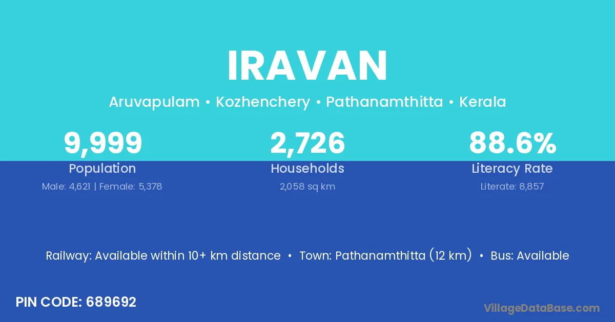 Pathanamthitta (12 km) is the nearest town to Iravan village for major economic activities and is located approximately 12 km away.