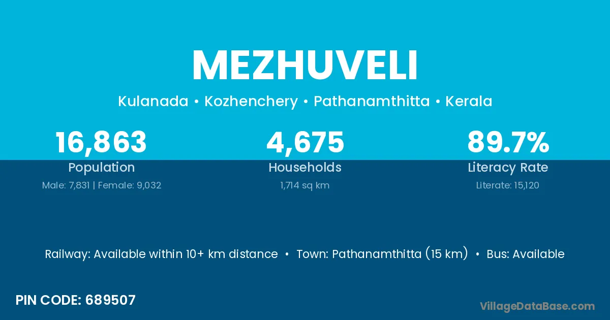 Mezhuveli village has a total population of 16,863 people, of which 7,831 are males and 9,032 are females.