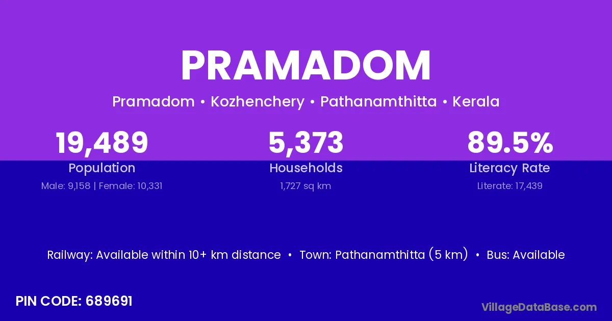 Pathanamthitta (5 km) is the nearest town to Pramadom village for major economic activities and is located approximately 5 km away.