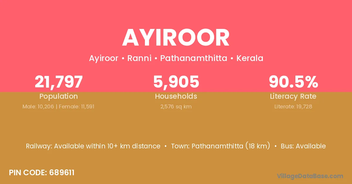 Pathanamthitta (18 km) is the nearest town to Ayiroor village for major economic activities and is located approximately 18 km away.
