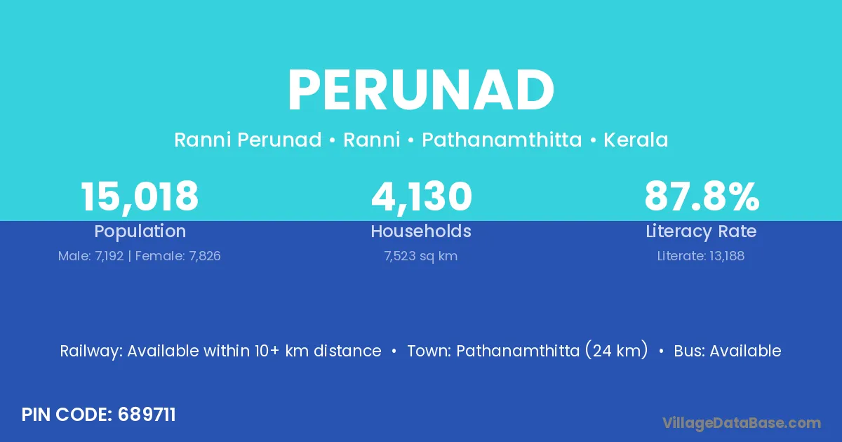Pathanamthitta (24 km) is the nearest town to Perunad village for major economic activities and is located approximately 24 km away.
