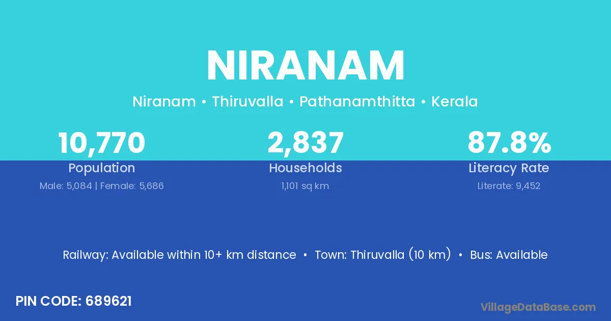 Thiruvalla (10 km) is the nearest town to Niranam village for major economic activities and is located approximately 10 km away.