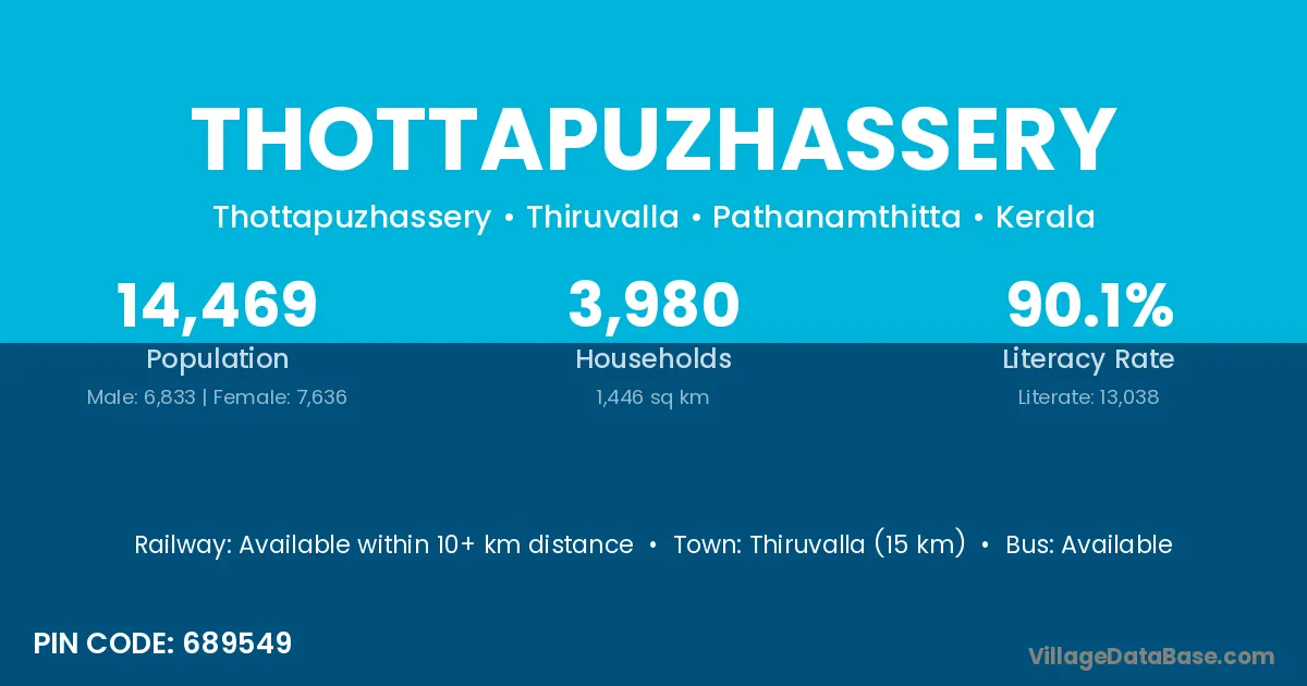 Thiruvalla (15 km) is the nearest town to Thottapuzhassery village for major economic activities and is located approximately 15 km away.