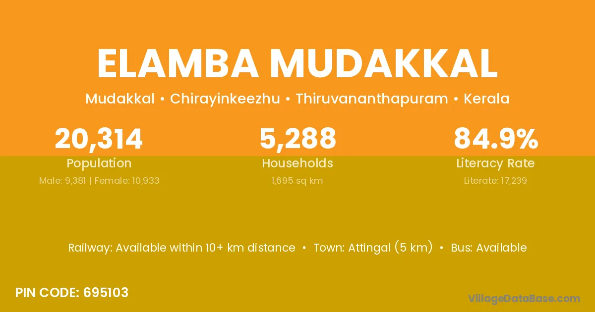 Attingal (5 km) is the nearest town to Elamba Mudakkal village for major economic activities and is located approximately 5 km away.