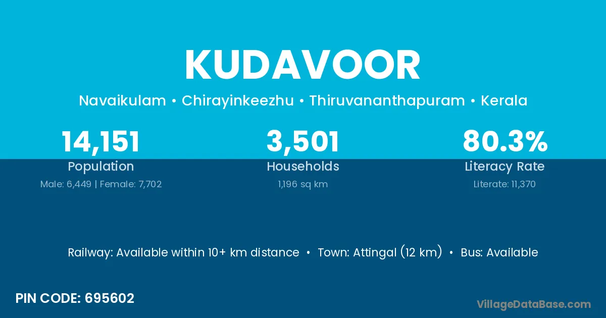 Attingal (12 km) is the nearest town to Kudavoor village for major economic activities and is located approximately 12 km away.