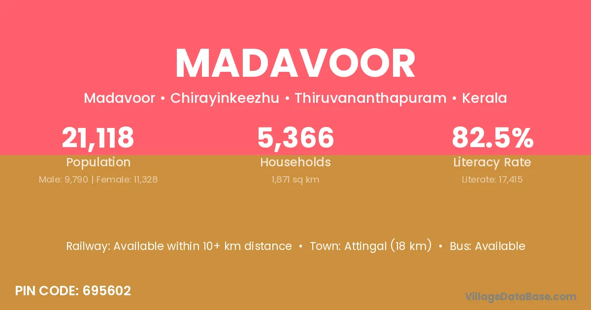 Attingal (18 km) is the nearest town to Madavoor village for major economic activities and is located approximately 18 km away.