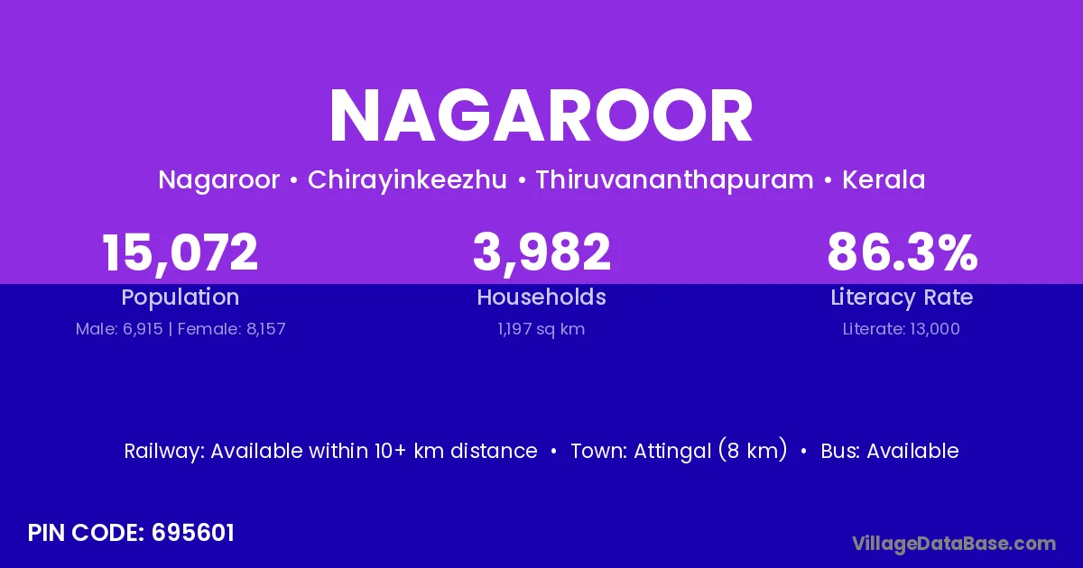 Attingal (8 km) is the nearest town to Nagaroor village for major economic activities and is located approximately 8 km away.