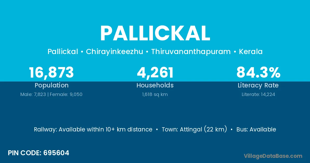 Attingal (22 km) is the nearest town to Pallickal village for major economic activities and is located approximately 22 km away.