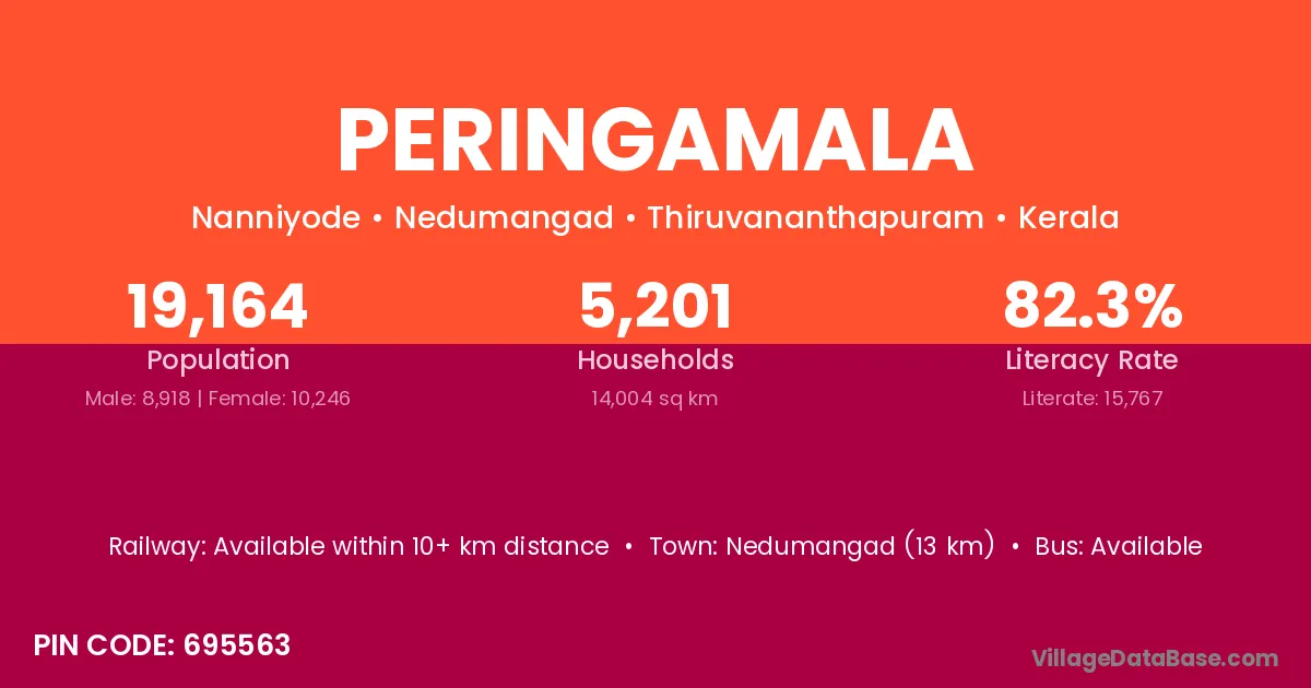 Nedumangad (13 km) is the nearest town to Peringamala village for major economic activities and is located approximately 13 km away.
