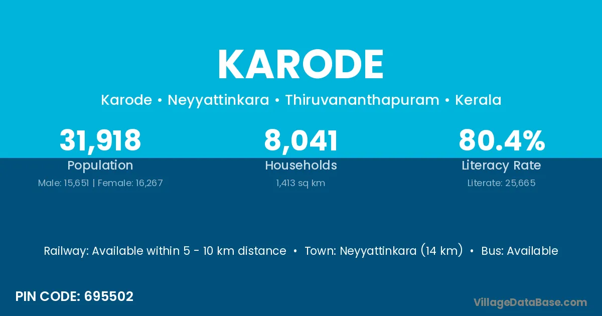 Neyyattinkara (14 km) is the nearest town to Karode village for major economic activities and is located approximately 14 km away.