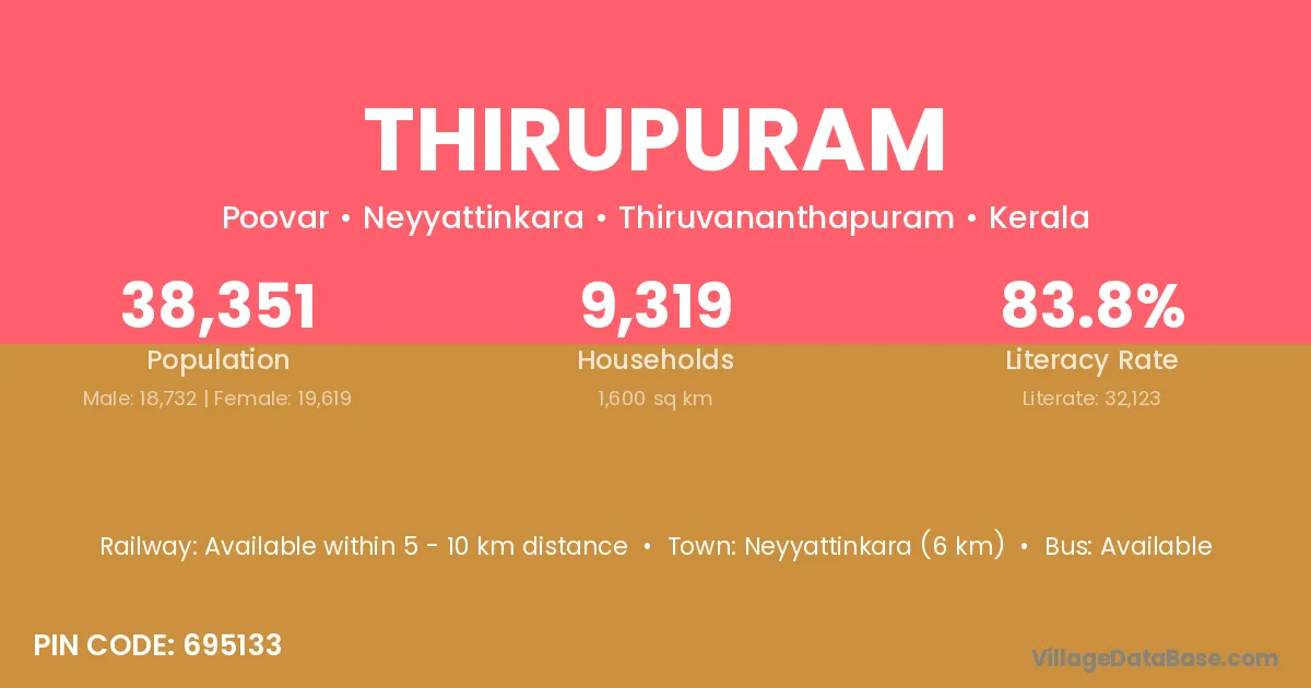 Neyyattinkara (6 km) is the nearest town to Thirupuram village for major economic activities and is located approximately 6 km away.