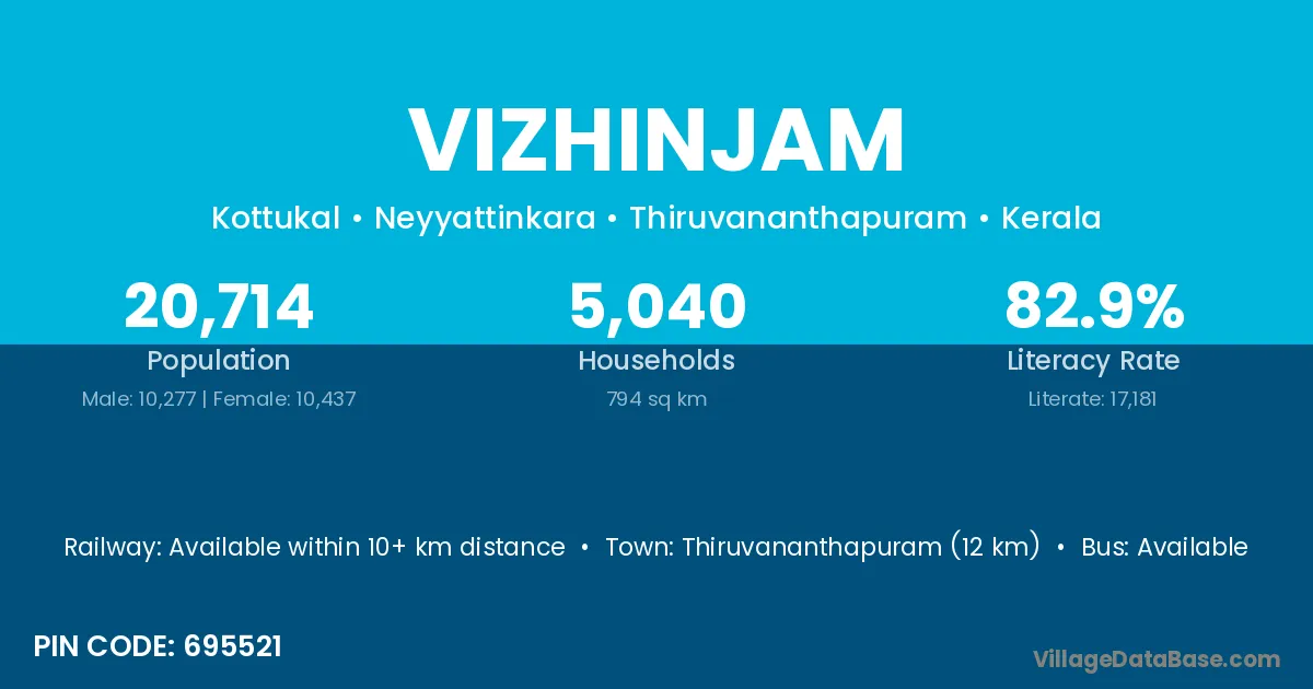 Vizhinjam village has a total population of 20,714 people, of which 10,277 are males and 10,437 are females.
