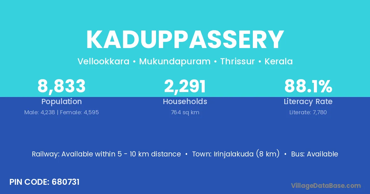Irinjalakuda (8 km) is the nearest town to Kaduppassery village for major economic activities and is located approximately 8 km away.