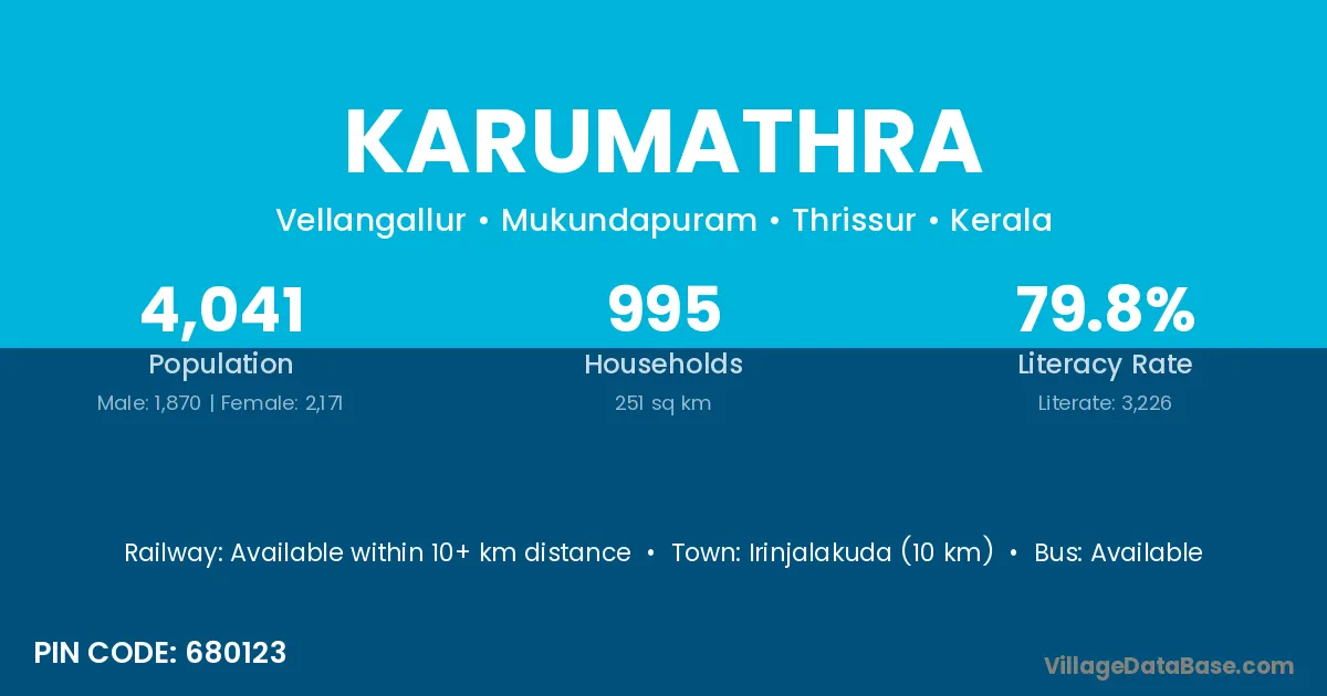 Irinjalakuda (10 km) is the nearest town to Karumathra village for major economic activities and is located approximately 10 km away.