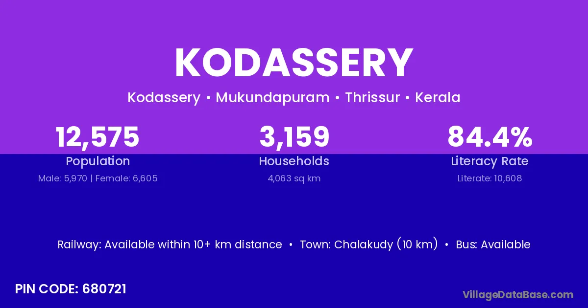 Chalakudy (10 km) is the nearest town to Kodassery village for major economic activities and is located approximately 10 km away.