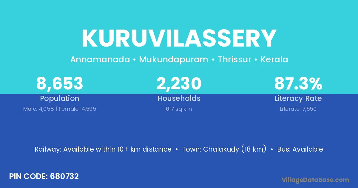 Chalakudy (18 km) is the nearest town to Kuruvilassery village for major economic activities and is located approximately 18 km away.