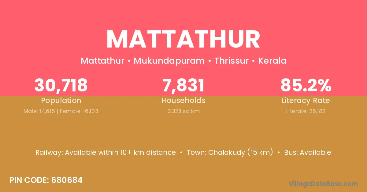 Chalakudy (15 km) is the nearest town to Mattathur village for major economic activities and is located approximately 15 km away.