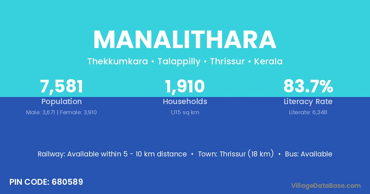 Thrissur (18 km) is the nearest town to Manalithara village for major economic activities and is located approximately 18 km away.