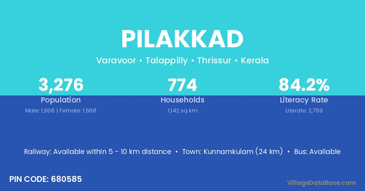 Kunnamkulam (24 km) is the nearest town to Pilakkad village for major economic activities and is located approximately 24 km away.