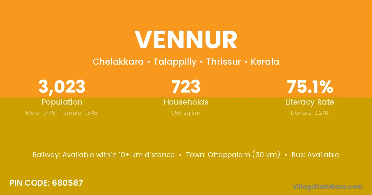 Ottappalam (30 km) is the nearest town to Vennur village for major economic activities and is located approximately 30 km away.