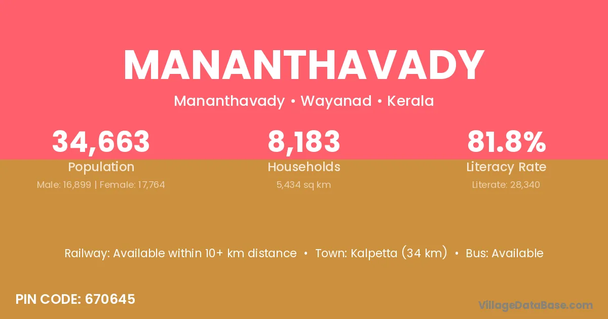 Kalpetta (34 km) is the nearest town to Mananthavady village for major economic activities and is located approximately 34 km away.