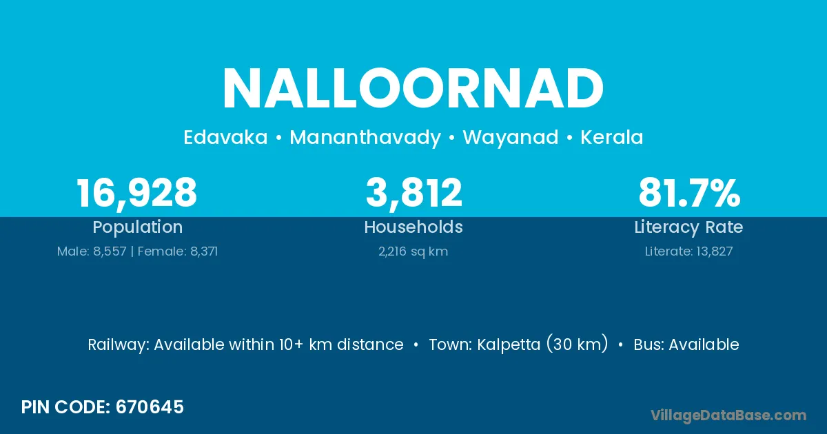 Kalpetta (30 km) is the nearest town to Nalloornad village for major economic activities and is located approximately 30 km away.