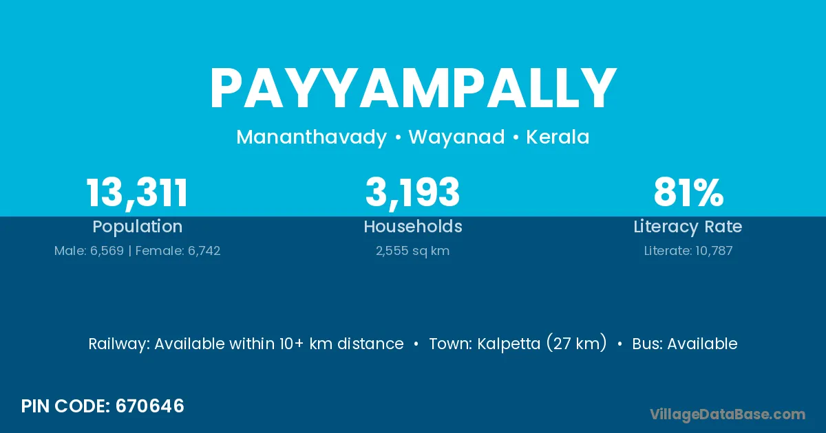 Kalpetta (27 km) is the nearest town to Payyampally village for major economic activities and is located approximately 27 km away.