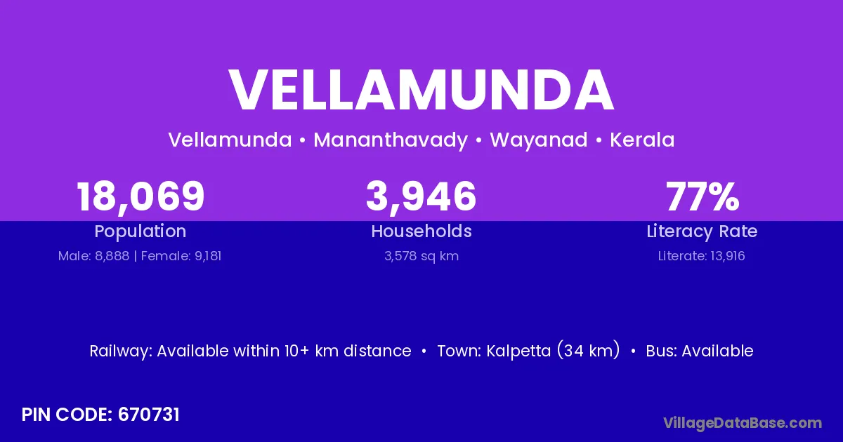 Kalpetta (34 km) is the nearest town to Vellamunda village for major economic activities and is located approximately 34 km away.