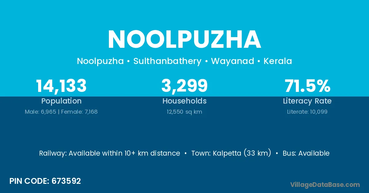 Kalpetta (33 km) is the nearest town to Noolpuzha village for major economic activities and is located approximately 33 km away.