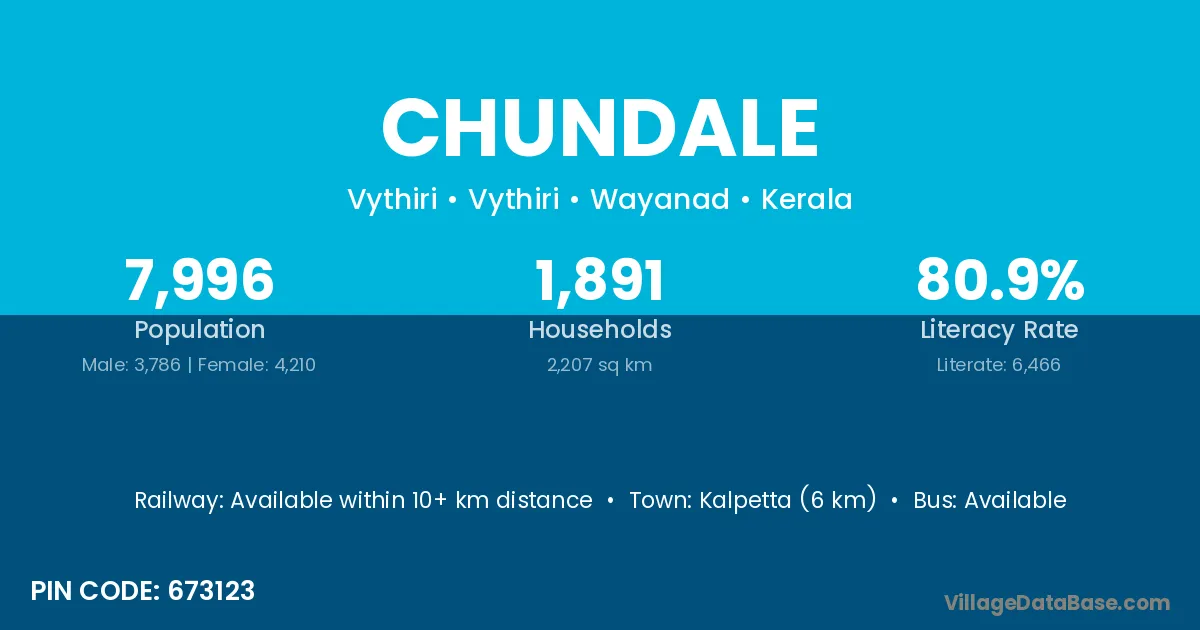 Kalpetta (6 km) is the nearest town to Chundale village for major economic activities and is located approximately 6 km away.