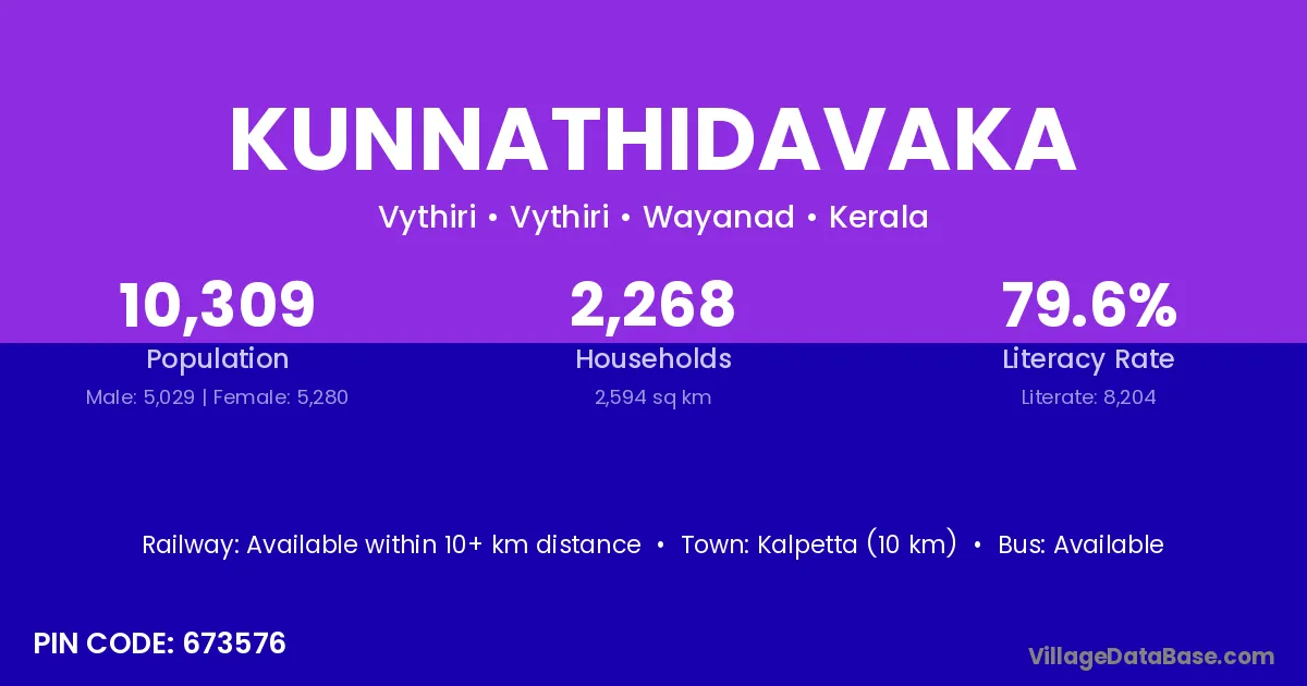 Kalpetta (10 km) is the nearest town to Kunnathidavaka village for major economic activities and is located approximately 10 km away.