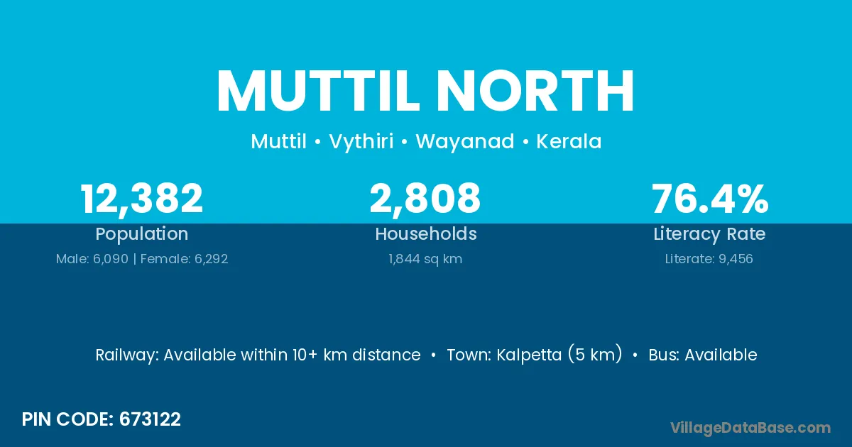 Kalpetta (5 km) is the nearest town to Muttil North village for major economic activities and is located approximately 5 km away.