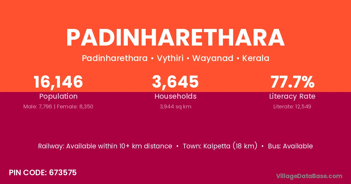 Kalpetta (18 km) is the nearest town to Padinharethara village for major economic activities and is located approximately 18 km away.