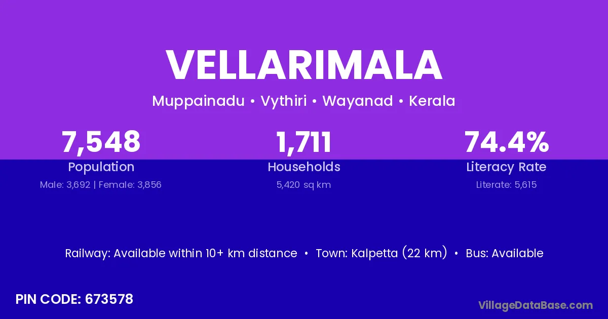 Vellarimala village has a total population of 7,548 people, of which 3,692 are males and 3,856 are females.