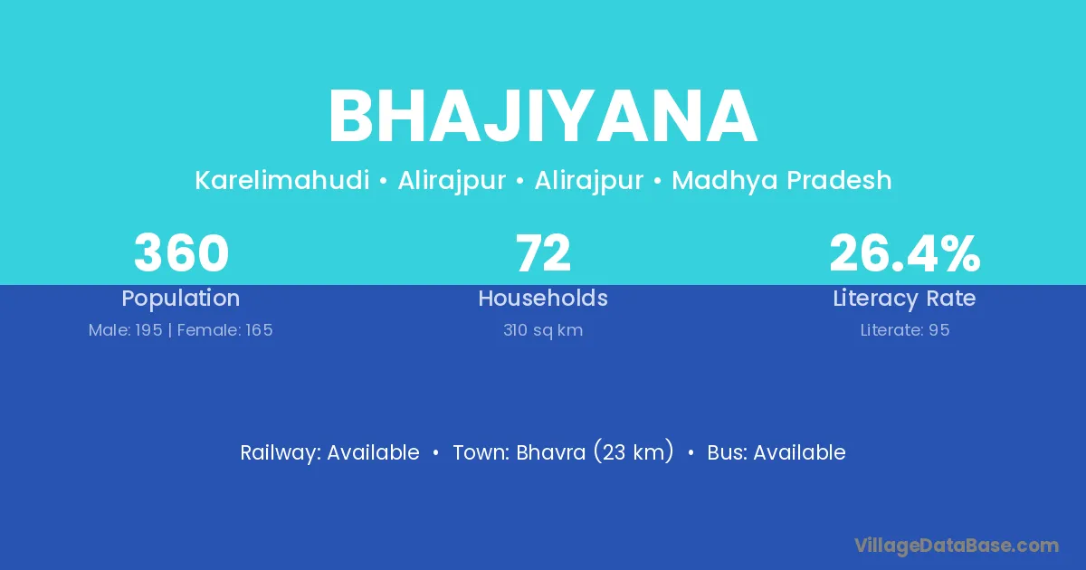 Bhajiyana village has a total population of 360 people, of which 195 are males and 165 are females.