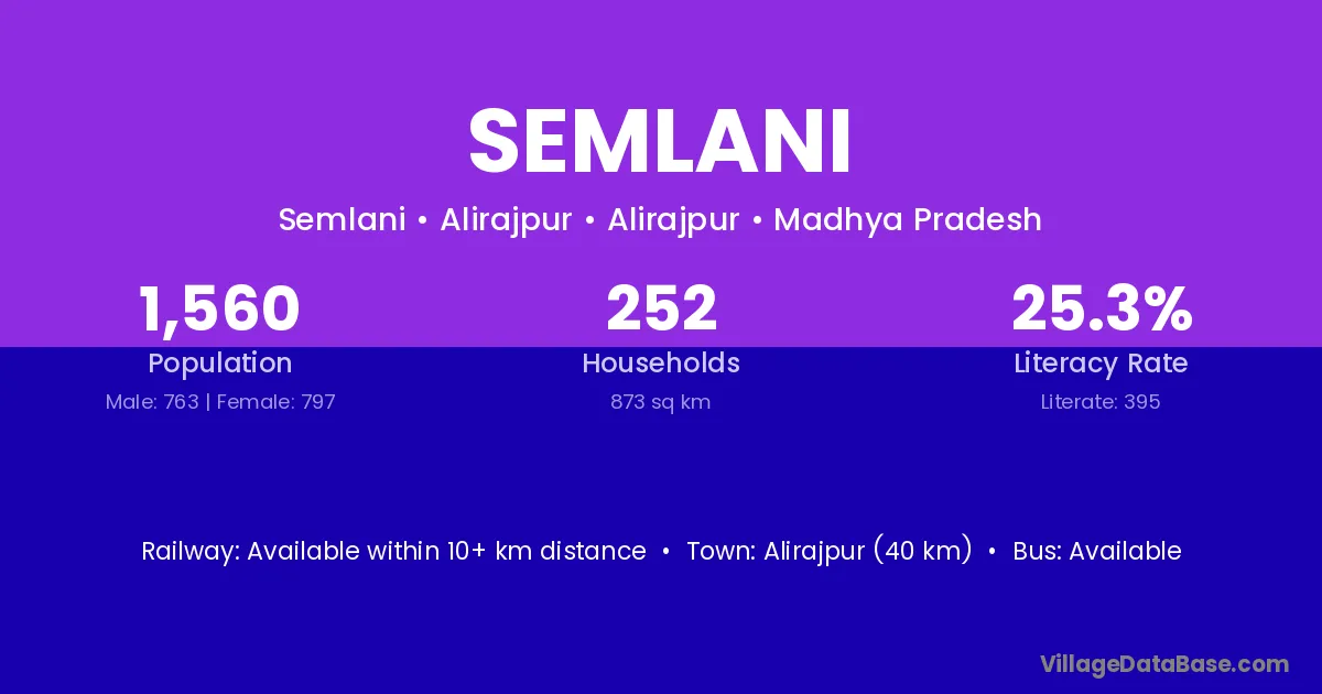 Alirajpur (40 km) is the nearest town to Semlani village for major economic activities and is located approximately 40 km away.
