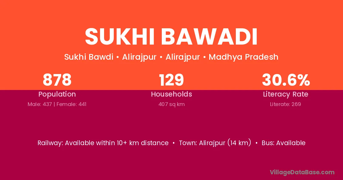 Alirajpur (14 km) is the nearest town to Sukhi Bawadi village for major economic activities and is located approximately 14 km away.