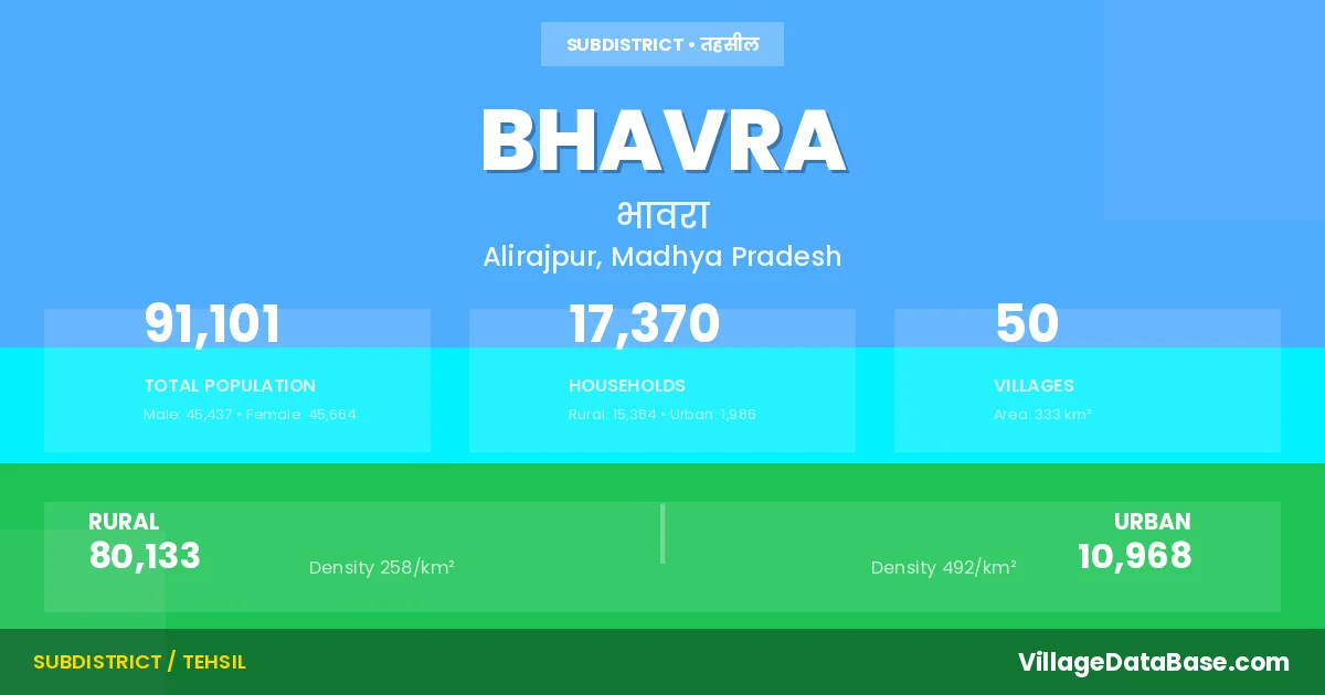 Bhavra is a town and Tehsil in the Alirajpur district of the Madhya Pradesh. In India, a Tehsil is a subdivision of a district responsible for the administration and revenue collection of a specific area within the district. Tehsils play a crucial role in the local governance structure, contributing significantly to the development and administration of their communities.