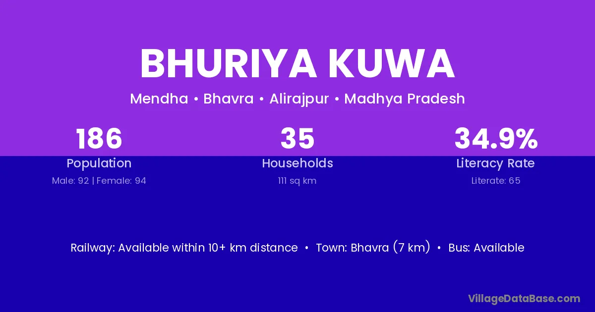 Bhuriya Kuwa village has a total population of 186 people, of which 92 are males and 94 are females.