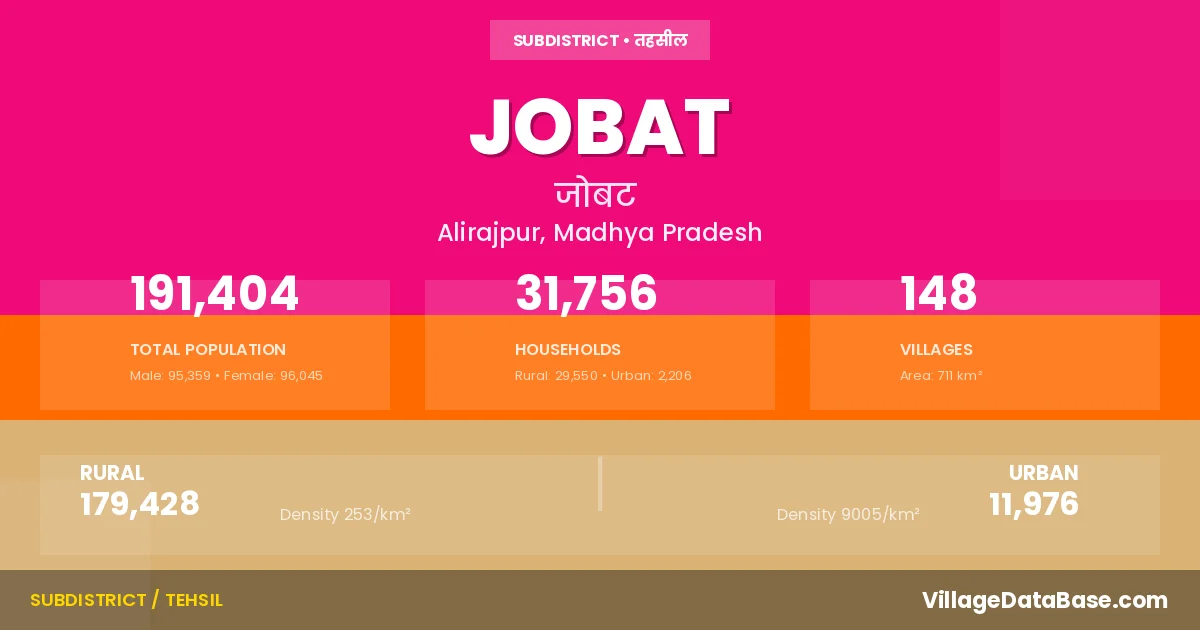 According to the 2011 census The total area of Jobat Tehsil is 711 km², with a population of 191404 people. The population density is 269 inhabitants per square kilometre, and there are approximately 31756 houses in the sub district.
