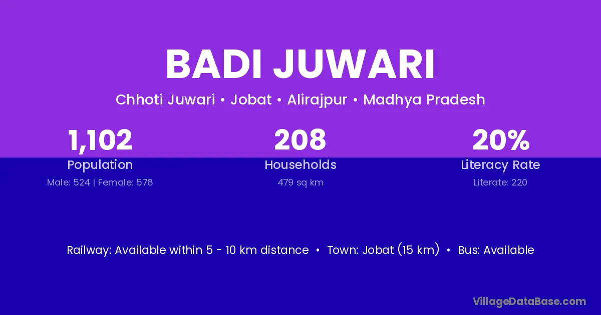 Jobat (15 km) is the nearest town to Badi Juwari village for major economic activities and is located approximately 15 km away.