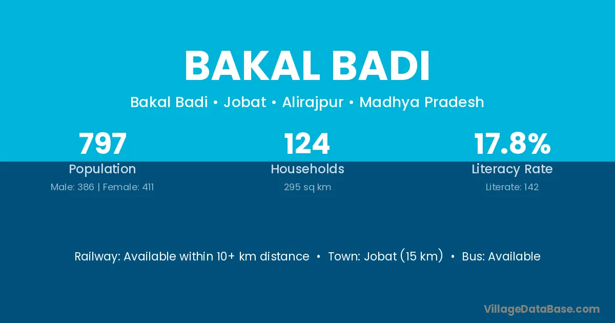 Jobat (15 km) is the nearest town to Bakal Badi village for major economic activities and is located approximately 15 km away.