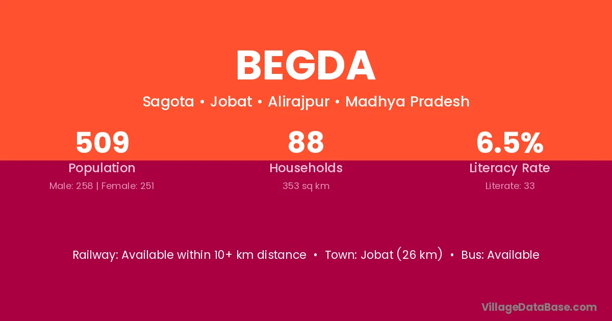 Jobat (26 km) is the nearest town to Begda village for major economic activities and is located approximately 26 km away.